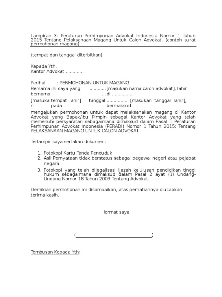Setelah membaca Contoh Surat Keterangan Magang Advokat disini, kalian pasti bisa menulis Contoh Surat Keterangan Magang Advokat. Contoh surat magang di kantor advokat contoh surat surat keterangan magang format lampiran 1 surat keterangan magang surat keterangan magang budiman surat keterangan magang bu flickr contoh surat keterangan magang advokat peradi nusagates lampiran 3 contoh surat permohonan magang petunjuk teknis pelaksanaan peraturan perhimpunan advokat indonesia nomor 1 tahun 2006 tentang pelaksanaan magang untuk calon advokat fran xaverius academia edu surat lamaran magang ke lawfrm gunadi contoh surat keterangan magang advokat nusagates lampiran surat keterangan magang